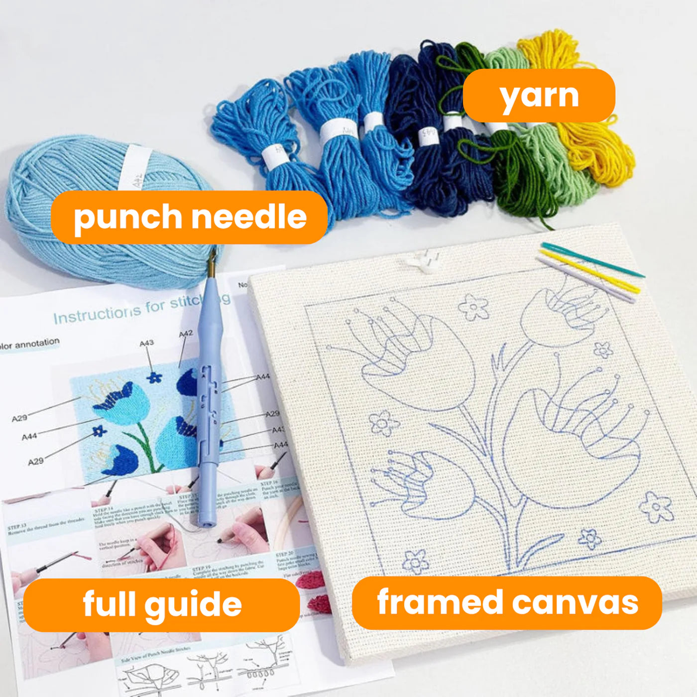 Our complete punch needle kit includes: 1x framed canvas with pre-printed design, 1x punch needle, 1x needle threading tool, 1x high-quality yarn, and 1x detailed guide—perfect for all skill levels!